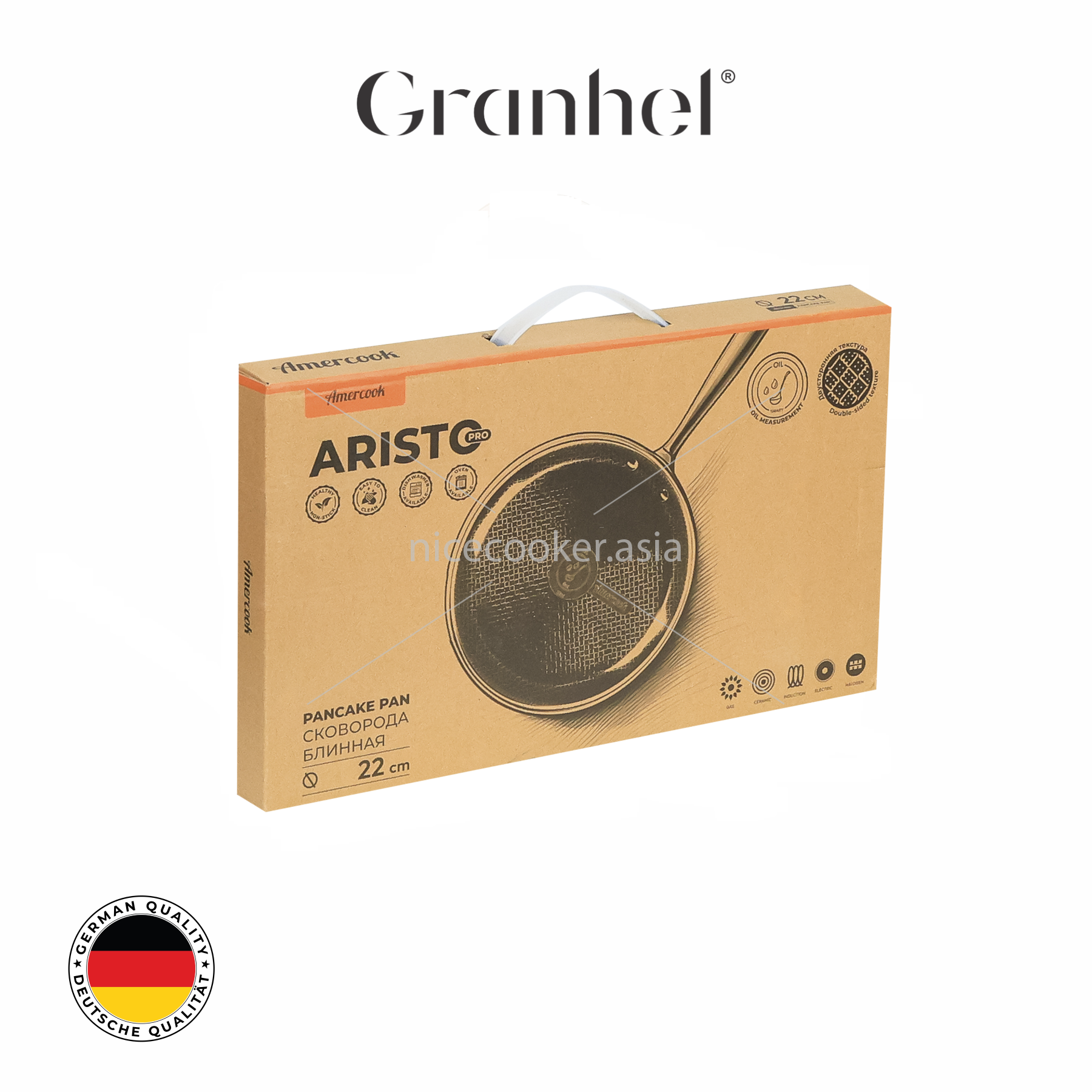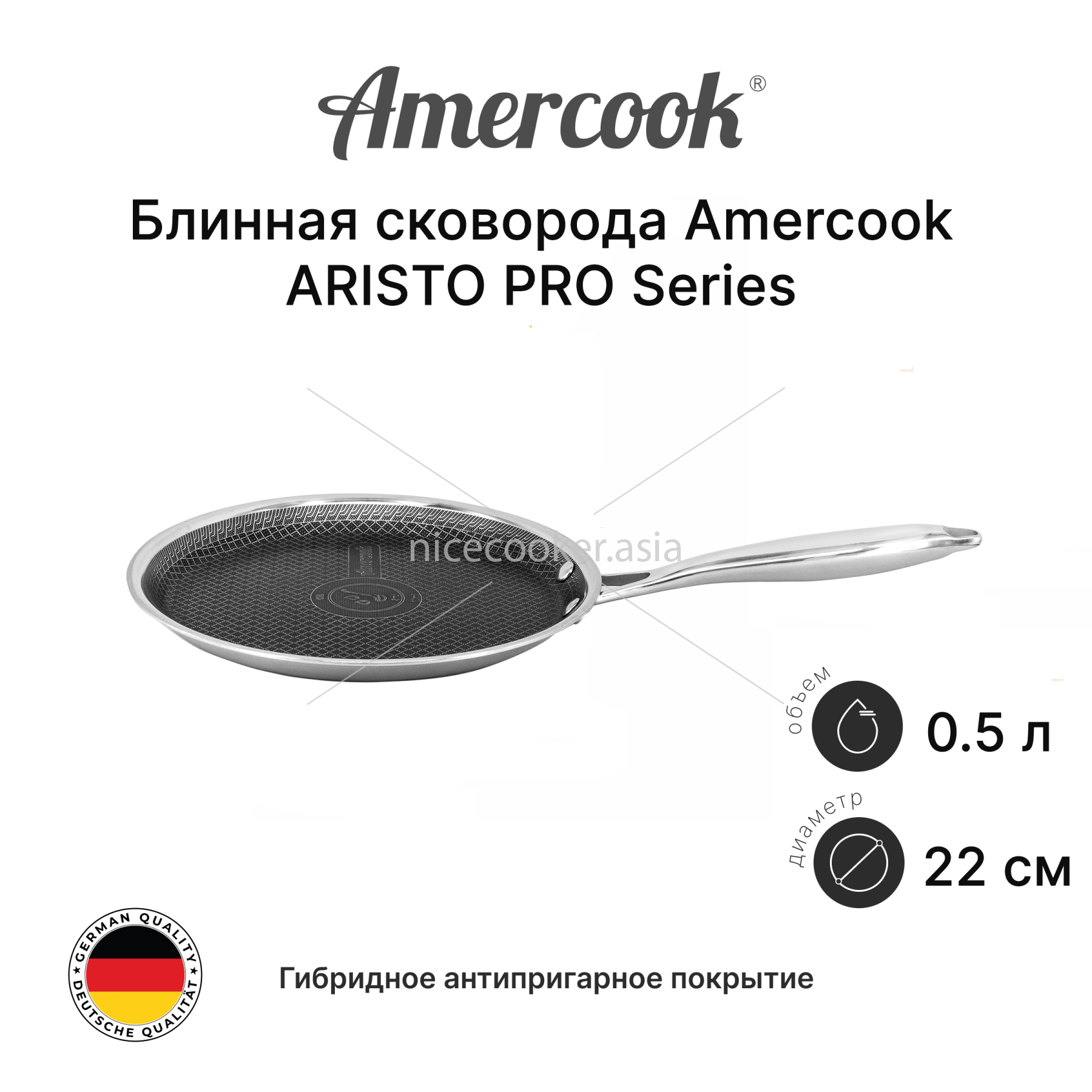 Блинная сковорода — это посуда для приготовления блинов и панкейков. Она отличается плоским дном и невысокими бортиками, что позволяет легко переворачивать блины и подрумянивать с обеих сторон. Блинная сковорода Amercook ARISTO PRO Series изготовлена из нержавеющей стали марки Stainless steel 18/10, имеет хорошую теплопроводность и устойчива к коррозии. Стальная цельнолитая конструкция без соединений и швов обеспечивает долговечность и устойчивость к высоким температурам. В блинной сковороде Amercook Aristo Pro Series применено гибридное антипригарное покрытие — это сочетание свойств нержавеющей стали и антипригарного покрытия. Гибридное покрытие устойчиво к воздействию пищевых кислот, а значит не портит вкус и качество блюд. Гибридное антипригарное покрытие с рельефным рисунком обеспечивает улучшенные антипригарные свойства и повышенную износостойкость. Эргономичные полые ручки нагреваются значительно меньше, чем обычные, обеспечивая комфортную работу с посудой без прихваток. Приготовление блюд в сковороде Amercook Aristo Pro Series позволяет использовать меньше масла, что способствует здоровому питанию Блинная сковорода Amercook ARISTO PRO Series отлично подойдет для приготовления блинов, панкейков, оладий, лепешек и даже для обжаривания тонких омлетов. Блинная сковорода Amercook ARISTO PRO Series является отличным предметом на любой кухне, обеспечивая удобство и практичность в процессе приготовления пищи.