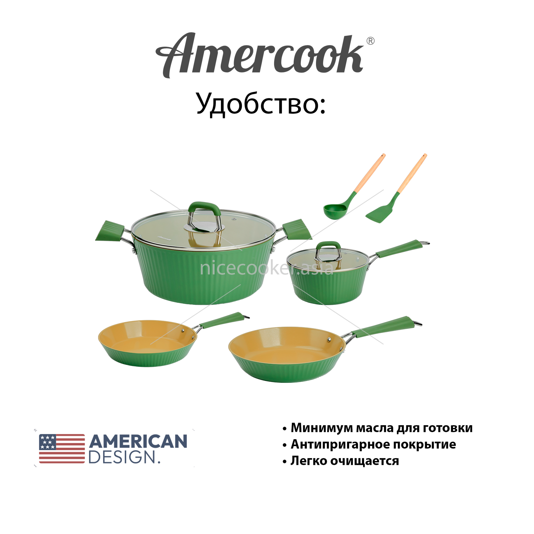 Набор Amercook Amvegan Series — это полноценный комплект кухонной посуды, включающий кастрюлю, ковш, две сковороды разного диаметра, а также половник и лопатку, чтобы вы могли готовить любые блюда с лёгкостью и комфортом. Каждое изделие разработано с учётом повседневных потребностей и сочетает функциональность с современным дизайном. Посуда оснащена BIO керамическим антипригарным покрытием, которое облегчает процесс готовки, позволяет использовать меньше масла. Многослойная конструкция обеспечивает быстрый и равномерный нагрев, а магнитное основание совместимо со всеми типами плит, включая индукционные. Эргономичные силиконовые ручки не нагреваются и обеспечивают комфортное и безопасное использование. Набор изготовлен из экологически безопасных материалов, устойчивых к износу, а стильный оливковый цвет подчёркивает эстетику кухни и гармонично вписывается в любой интерьер. Экологически безопасное покрытие НЕ СОДЕРЖИТ PFAS, PFOA и BPA, отличается повышенной износостойкостью и подходит для ежедневного использования. Преимущества: • BIO - керамическое антипригарное покрытие • Эффект лотоса — самоочищающаяся поверхность • Подходит для всех типов плит, включая индукционные • Равномерный и быстрый нагрев • Экологически безопасные материалы • Повышенная износостойкость • Все необходимые предметы для полноценной кухни в одном наборе Набор Amercook Amvegan Series — практичное и стильное решение для ежедневной готовки, которое делает процесс приготовления простым, удобным и приятным.
