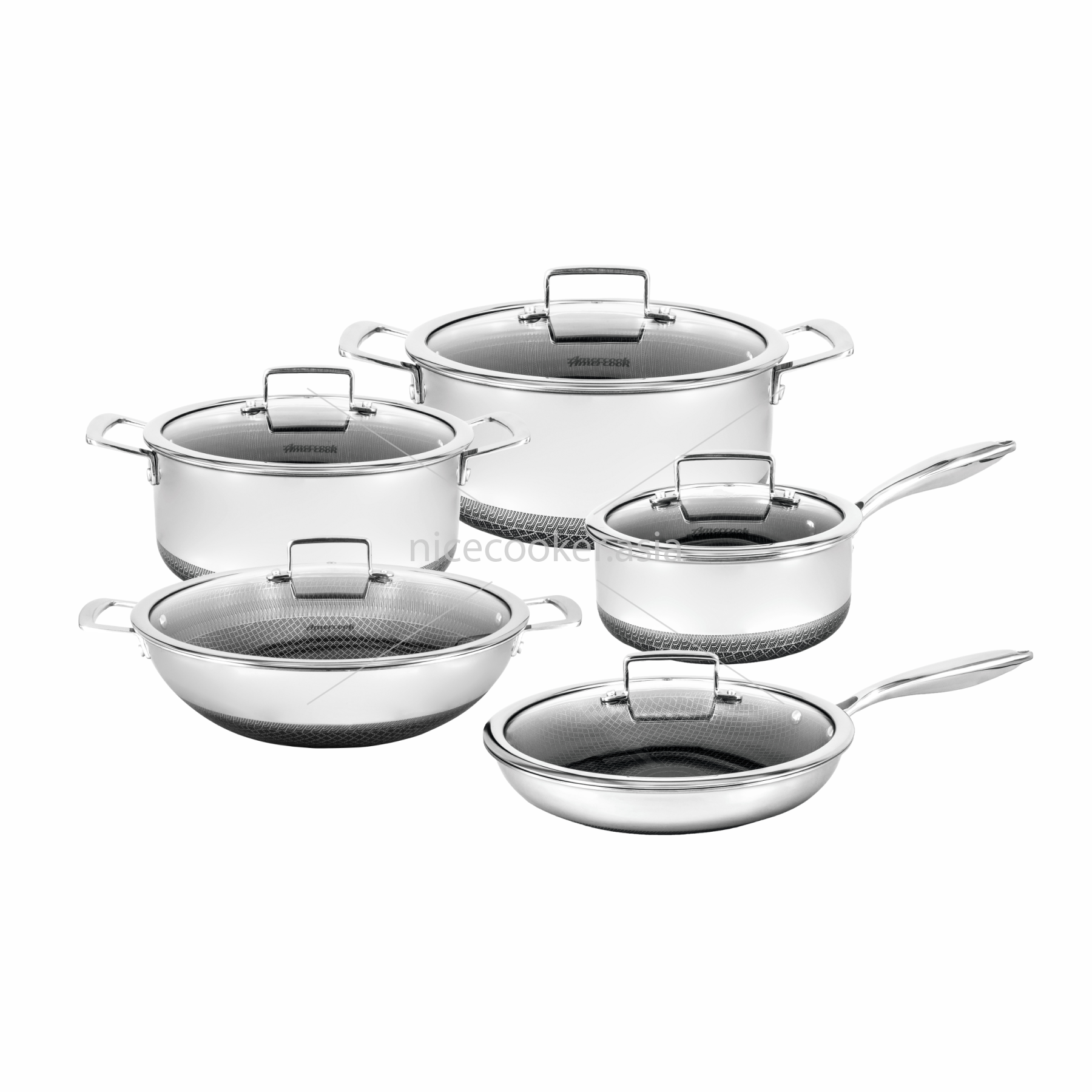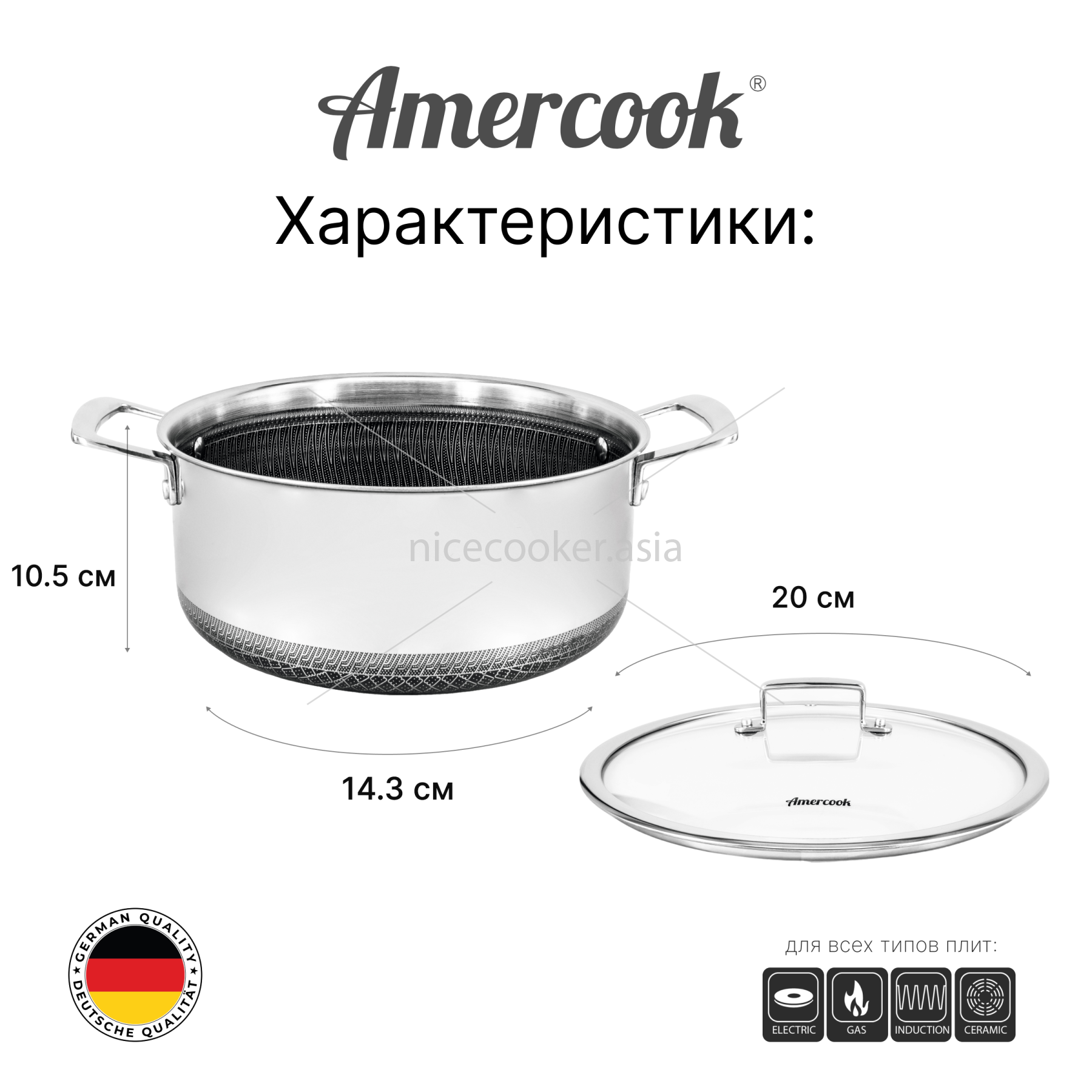 Набор посуды из нержавеющей стали — это отличный комплект для любой кухни, сочетающий в себе стиль, долговечность и удобство. Набор посуды Набор Amercook ARISTO PRO изготовлен из нержавеющей стали марки SUS 304, имеет хорошую теплопроводность и устойчив к коррозии. Стальная цельнолитая конструкция обеспечивает долговечность и устойчивость к высоким температурам. В наборе посуды Amercook ARISTO PRO применено гибридное антипригарное покрытие — это сочетание свойств нержавеющей стали и антипригарного покрытия. Гибридное покрытие устойчиво к воздействию пищевых кислот, а значит не портит вкус и качество блюд. Гибридное антипригарное покрытие с рельефным рисунком обеспечивает улучшенные антипригарные свойства и повышенную износостойкость. Эргономичные полые ручки нагреваются значительно меньше, чем обычные, обеспечивая комфортную работу с посудой без прихваток. Приготовление блюд наборе посуды Amercook ARISTO PRO позволяет использовать меньше масла, что способствует здоровому питанию!