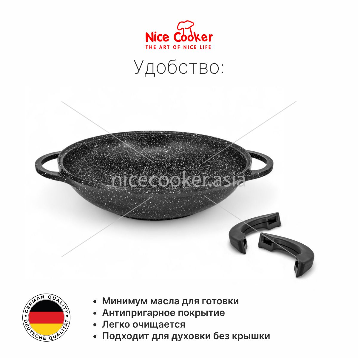 Wok-казан Nice Cooker Classic Series. Рецепты для приготовления в Wok-казане пользуются большой популярностью. Wok-казан от Nice Cooker, с прихватками в комплекте, обязательно появиться на каждой кухне. Мраморное покрытие поверхности предотвращает пригорание, что позволяет готовить с минимальным добавлением масла.